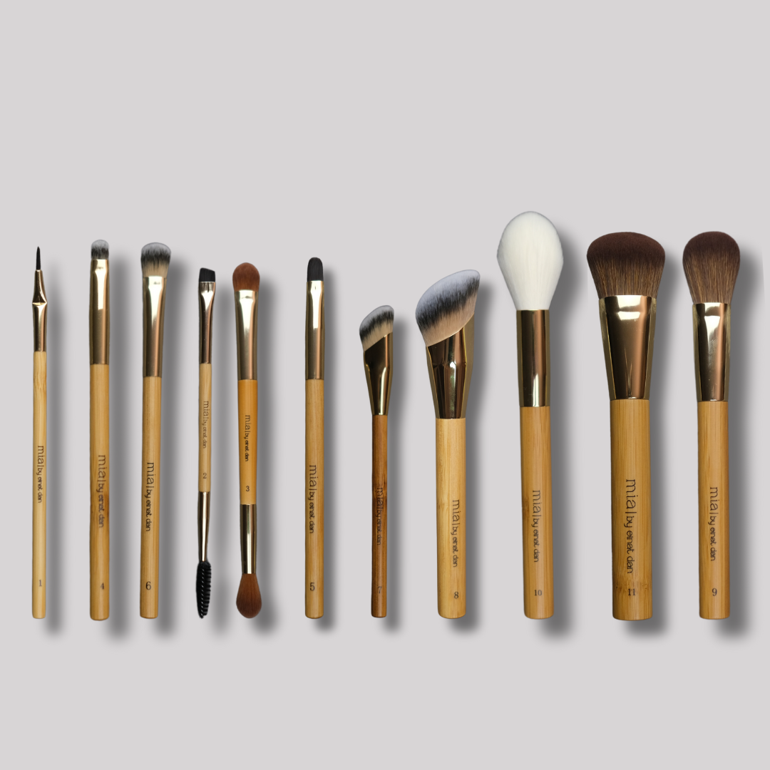 The M.I.A. Terra Collection is designed for makeup artists and beauty lovers alike, combining the highest quality synthetic hair with eco-friendly bamboo handles. This set of 11 expertly crafted brushes covers every step of your makeup routine, ensuring precision and perfection in every application.